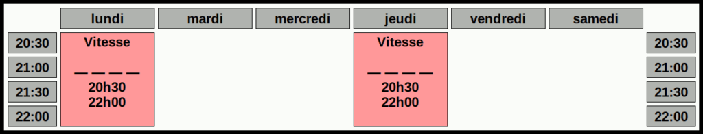 - Les cours roller vitesse adultes se déroulent le lundi et le jeudi de 20:30 à 22:00.