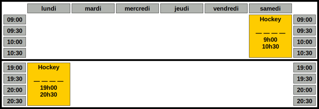 Les cours roller hockey adultes se déroulent le lundi de 19:00 à 20:30 et le samedi de 9:00 à 10:30.